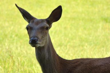 Keywords: doe red deer wild forest forest animal nature animal animal world paarhufer meadow grass green peaceful wild animal in the free hirsch happy attention