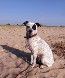 Keywords: dog hybrid male white black spotted pirate eye beach wet bathed elbe