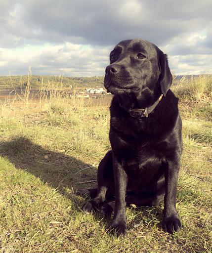 Keywords: dog labrador sitting dog grass nature meadow the sky the clouds black dog