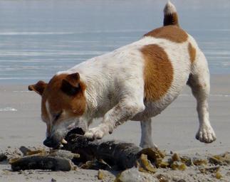 Keywords: dog play beach teeth jack russel bite romp batons algae water animal
