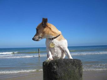 Keywords: doggy dog pet animal animals dogs jack russel sea zealand water air blue sand pole