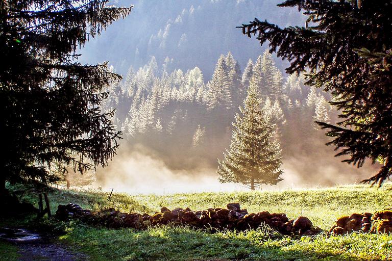 Keywords: dolomites malga ciapela marmolada italy forest trees fog dew plants mountain green foliage hiking