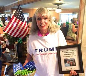 | Keywords: Donald Trump Welcome to a Hasty Happy Hour.jpg en Lifelong Democrat Terrie Frankel in living room holding Welcome to Terrie and Fred's Hasty Happy Hour sign; wearing TRUMP Make America Great Again T-shirt A former USO performer during the Vietnam War and big supporter of our military veterans and police Note Blue Lives Matter bumper stickers in photo 2016-06-24 19 25 18 own TwinsofSedona other versions cc-zero Supporters of the Donald Trump presidential campaign 2016 Donald Trump presidential campaign 2016 Donald J Trump Donald J Trump Fans Terrie Frankel Blue Lives Matter Veterans Lives Matter Make America Great Again |