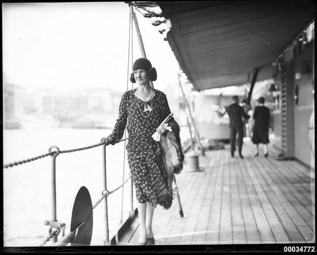 | Keywords: samuel j hood collection samueljhoodcollection hnlms java hnlmsjava hnlms eversten hnlmseversten hnlms de ruyter hnlmsderuyter dutch dutch navy visit to sydney dutchnavyvisittosydney dutch navy dutchnavy royal netherlands navy royalnetherlandsnavy the koninklijke marine thekoninklijkemarine west circular quay westcircularquay sydney harbour sydneyharbour harbour scenes harbourscenes sydney harbour bridge sydneyharbourbridge rear-admiral c c kayser rearadmiralcckayser naval vessel navalvessel vintage vintage clothing vintageclothing vintage fashion vintagefashion vintage hats vintagehats fox fur foxfur 1920s fashion 1920sfashion 1930s fashion 1930sfashion 1920s clothing 1920sclothing 1930s clothing 1930sclothing woman donna adelaide grossardi donnaadelaidegrossardi antonio grossardi antoniogrossardi adrienne grossardi adriennegrossardi italian consul-general italianconsulgeneral ship warship koninklijke marine koninklijkemarine km hnlms java (1921) hnlmsjava1921 java-class javaclass cruiser light cruiser lightcruiser sunk battle of the java sea battleofthejavasea battle of java sea battleofjavasea blackandwhite monochrome black and white The Koninklijke Marine (Royal Netherlands Navy) including HNLMS JAVA, HNLMS EVERSTEN and HNLMS DE RUYTER arrived in Sydney on 3 October 1930. The ships berthed in West Circular Quay and The Sydney Morning Herald reported on the 'unfamiliar spectacle' of the Dutch squadron arrival. On 10 October, the squadron hosted a reception on board JAVA 'as a return for the hospitality they had received while in Sydney'. The SMH reported that distinguished guests were greeted by the Dutch Consul-General P E Teppema, Madame Teppema and Rear-Admiral Kayser. This image depicts the Italian Consul-General Antonio Grossardi's wife, Donna Adelaide Grossardi, who was described as wearing 'black printed silk and a black velour hat'. This photo is part of the Australian National Maritime Museum’s Samuel J. Hood Studio collection. Sam Hood (1872-1953) was a Sydney photographer with a passion for ships. His 60-year career spanned the romantic age of sail and two world wars. The photos in the collection were taken mainly in Sydney and Newcastle during the first half of the 20th century. The ANMM undertakes research and accepts public comments that enhance the information we hold about images in our collection. This record has been updated accordingly. Photographer: Samuel J. Hood Studio Collection Object no. 00034772 Check out our blog on naval visits to Sydney bit.ly/MTtR5H The Koninklijke Marine (Royal Netherlands Navy) including HNLMS JAVA, HNLMS EVERSTEN and HNLMS DE RUYTER arrived in Sydney on 3 October 1930. The ships berthed in West Circular Quay and The Sydney Morning Herald reported on the 'unfamiliar spectacle' of the Dutch squadron arrival. On 10 October, the squadron hosted a reception on board JAVA 'as a return for the hospitality they had received while in Sydney'. The SMH reported that distinguished guests were greeted by the Dutch Consul-General P E Teppema, Madame Teppema and Rear-Admiral Kayser. This image depicts the Italian Consul-General Antonio Grossardi's wife, Donna Adelaide Grossardi, who was described as wearing 'black printed silk and a black velour hat'. This photo is part of the Australian National Maritime Museum’s Samuel J. Hood Studio collection. Sam Hood (1872-1953) was a Sydney photographer with a passion for ships. His 60-year career spanned the romantic age of sail and two world wars. The photos in the collection were taken mainly in Sydney and Newcastle during the first half of the 20th century. The ANMM undertakes research and accepts public comments that enhance the information we hold about images in our collection. This record has been updated accordingly. Photographer: Samuel J. Hood Studio Collection Object no. 00034772 Check out our blog on naval visits to Sydney bit.ly/MTtR5H The Koninklijke Marine (Royal Netherlands Navy) including HNLMS JAVA, HNLMS EVERSTEN and HNLMS DE RUYTER arrived in Sydney on 3 October 1930. The ships berthed in West Circular Quay and The Sydney Morning Herald reported on the 'unfamiliar spectacle' of the Dutch squadron arrival.