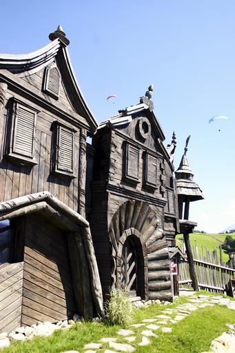 Keywords: donovaly habakuky slovakia fairy tales house drevenica fence paragliding green grass the countryside village wooden fence blue sky trip old
