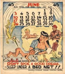 Keywords: Don’t spoil a good dream sleep under a bed net..JPG en A naked man is shown sleeping on a cot In a dream bubble above his head are images of a beautiful woman a naked baby a man carrying a rifle a man swing a golf club and an obedient dog In reality outside the dream bubble an oversized mosquito is about to bite the posterior of the sleeping man 2013-09-25 17 05 17 Courtesy of the National Library of Medicine Images from the History of Medicine IHM http //ihm nlm nih gov/images/C06236 Also showcased in the book Hidden Treasure New York NY Blast Books 2012 p 172 HMD Prints Photos call number PP059709 cab Washington D C U S Army 1945 Custom license marker 2013 09 25 PD-USGov Uploaded with UploadWizard World War II anti-malaria posters from the United States Dreaming Mosquitos in art 20th-century cartoons Mosquito nets |
