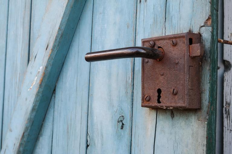 Keywords: door castle door lock stainless rusty old goal metal door handle rusted handle key hole jack door knob blue brown wood wooden door screw head screw