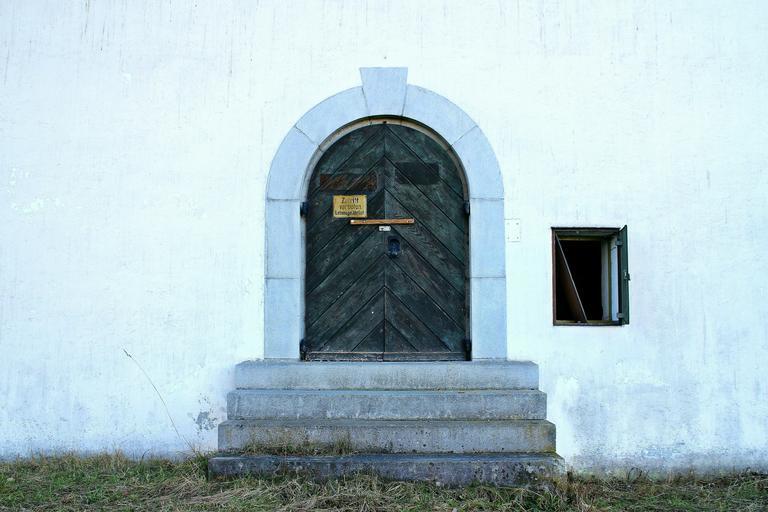 Keywords: door front door house entrance hinged door double door wood round arch arched door leave locked closed stairs stair step up gradually natural steps stone stairway