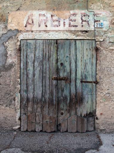 Keywords: door old barber shop old barber's shop doorway dilapidated repaired doors stone lintel carved date retro