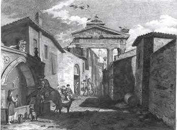 Keywords: Doric Portico at Athens, Stuart, 1762.JPG Τζέιμς Στούαρτ του 1762 Εικονίζει έναν δρόμο της Αθήνας Στο κέντρο φαίνεται η δωρική ύλη της Αρχηγέτιδος Αθηνάς στη δυτική λευρά της Ρωμαϊκής Αγοράς ενώ ανάμεσα στους κίονες διακρίνουμε τον μιναρέ τζαμιού Στα δεξιά διακρίνουμε την εκκλησία του Αγίου Σωτήρα Στα αριστερά βλέ ουμε στον εξωτερικό τοίχο ενός σ ιτιού μια μεγάλη δημόσια βρύση και λίγο ιο στο βάθος την είσοδο ενός χανιού Ο τοίχος με την όρτα α ό την ο οία βγαίνει ένας διαβάτης ανήκει στην οικία ου έμενε ο Γάλλος Πρέσβης Monsieur Etiene Leoufon Αυτός δα άνησε για την αναστήλωση της μεγάλης δημόσιας βρύσης en coperplate of the Doric Portico at Athens James Stuart 1713-1788 ίκολας Ρεβέττ 1720-1804 William Newton 1735-1790 The antiqvities of Athens Τόμος Α΄ Printed by J Haberkorn London 1762 http //www archive org/stream/antiqvitiesAthe1Stua page/3/mode/1up 3 και http //www archive org/stream/antiqvitiesAthe1Stua page/n30/mode/1up ίνακας Ι http //www archive org/details/antiqvitiesAthe1Stua Creator James Stuart 1762 PD-old-100 Doric Portico at Athens by James Stuart |
