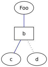 | Keywords: DotLanguageAttributes.svg 2007-03-07 own assumed AzaToth <code><pre> graph graphname // The label attribute can be used to change the label of a node a label Foo ; // Here the node shape is changed b shape box; // These edges both have different line properties a -- b -- c color blue; b -- d style dotted; </pre></code> Tree charts Images with Dot source code |