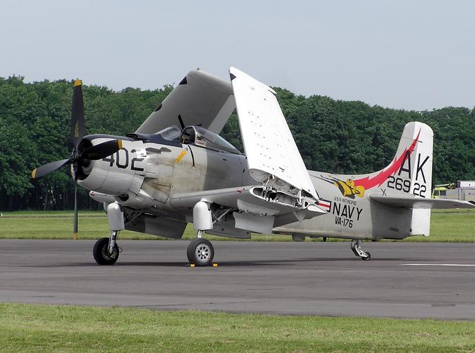 Keywords: Douglas.skyraider.folded.arp.jpg Douglas Skyraider with wings folded at Kemble Airfield Gloucestershire England This Douglas AD-4N Skyraider BuNo 126922 is an ex-US Marine Corps example that later served with the French Air Force in 1960 and the Gabonaise Air Force in 1976 It is painted as a A-1H AD-6 of attack squadron VA-176 Thunderbolts which was assigned to Attack Carrier Air Wing Ten CVW-10 during a deployment to Vietnam on the aircraft carrier USS Intrepid CVS-11 from 4 April to 21 November 1966 The real aircraft AK-402 was acutally A-1H BuNo 134472 It was later transferred to the South Vietnam Air Force Flown to Thailand in 1975 it is now on display in the Royal Thai Air Force Museum in US Air Force colours http //www airliners net/open file/1173720/M Skyraiders first went in to service in 1945 This aircraft is privately owned and UK registered as G-RAID Photographed by Adrian Pingstone in June 2005 and released to the public domain Arpingstone Folding wings G-RAID aircraft Aircraft at Cotswold Airport 2005 in aviation in the United Kingdom June 2005 in Gloucestershire |