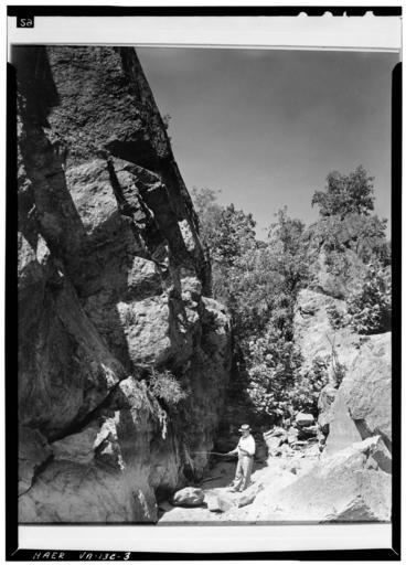 | Keywords: Downstream end of Great Falls Patowmack Canal from HABS.png en Downstream end of Great Falls Patowmack Canal HABS says 3 View of the mouth of George Washington's 'Potowmack' Canal at the Great Falls of the Potomac River The view is taken from a rock in the Potomac River looking up into the Canal Trees and dense growth now fill the old aperture which once permitted barges to come down the Ohio Valley onto the broad expanse of the Potomac River This view taken September 1 1943 evidences the very low water then existing on the Potomac River as is clearly shown by the water marks on the rocks on the left hand side of the photograph That portion where the individual is standing up to the height of his hat is normally underwater Deep in the sand at this spot was found a part of one of the old hand brought wrought lock hinges which formerly swung the first lock gates - Potowmack Company Great Falls Canal Locks No 3 4 5 Great Falls Fairfax County VA LOC-image hhh va1447 Historic American Buildings Survey 1 Sept 1941 VA-13C-3 Patowmack Canal |