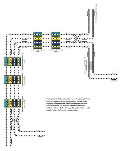 | Keywords: Downtown Connector track system.png Four-track system for the proposed Los Angeles Downtown Light-Rail Connector The station platforms are color-coded according to the destination The two service crossovers one located near the northeast end and the other near the southwest end allow the even distribution of the headways between the four tracks and they also make it possible to assign unique platforms for each destination Own 2007-11-13 Esirgen Rail transport diagrams Los Angeles County Metropolitan Transportation Authority |
