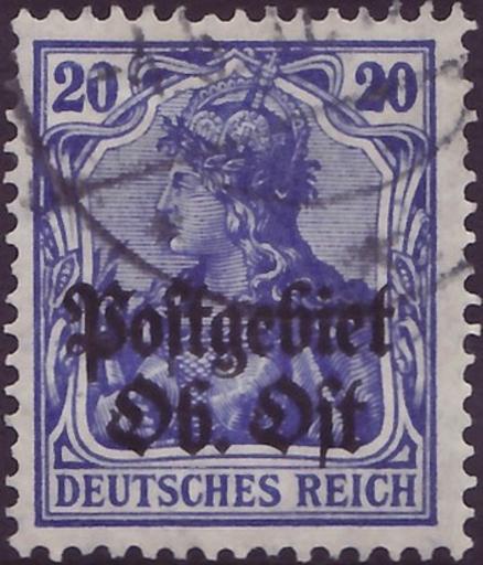 | Keywords: DR 1916 OberOst MiNr020a B002.jpg Stamp of Germany; 1916; postal area Oberbefehlshaber Ost Ober-Ost Michel Germany No 87Ia with two-line black overprint in German type Postgebiet / Ob Ost <br /> Stamp Germany German occupation issues 1914/18 for postal area Ober-Ost Michel No 8a Michel No 87Ia Germany with overprint; Yvert Tellier No 85 with overprint <br />; Germania-Issue Deutsches Reich with striped background<br /> Color ultramarine<br /> Watermark Germany No 1 rhombs <br /> Nominal value 20 Pfennig <br /> Postage value - 1916-01-15 1918-12-28 <br /> scan of original other date 1916-01-15 first issue day <br /> other date 1916-05-04 date of postmark Deutsche Reichspost - Deutsche Landespost Baltikum PD-old PD-Germany-§134-KUG Anna Führing with imperial crown and with two-line black overprint in German type Postgebiet / Ob Ost <br /> Michel No 87Ia; Yvert Tellier No 85; with overprint Michel Ober-Ost No 8a other date 1916-01-15 Deutsche Reichspost - Deutsche Landespost Baltikum Creator Paul Eduard Waldraff Reichsdruckerei Berlin letterpress printing - freedom press comb perforation K 14 14¼ Deutsches Reich - Deutsche Besetzngsausgaben 1914/18 - Postgebiet Oberbefehlshaber Ost Nr 8 a 1916 stamps of the German Empire Overprints on Germania stamps 1916 stamps of Germany for Russia Stamps of the postal area Oberbefehlshaber Ost 08_2 |
