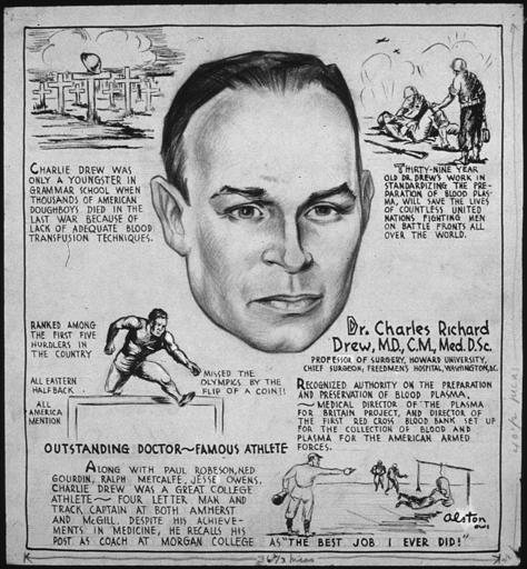 | Keywords: DR. CHARLES RICHARD DREW, M.D., C.M., MED. D.Sc. - PROFESSOR OF SURGERY, HOWARD UNIVERSTITY, CHIEF SURGEON... - NARA - 535693.jpg Scope and content Dr Charles Drew - with biographical paragraphs General notes 535693 Local identifier 208-COM-230 Office for Emergency Management Office of War Information Domestic Operations Branch News Bureau 06/13/1942 - 09/15/1945 NARA-Author Alston Charles Henry 1907-1977 Artist 3569253 <br /> Still Picture Records Section Special Media Archives Services Division NWCS-S National Archives at College Park 8601 Adelphi Road College Park MD 20740-6001 1943 Record group Record Group 208 Records of the Office of War Information 1926 - 1951 Record group ARC 535 Artworks and Mockups for Cartoons Promoting the War Effort and Original Sketches by Charles Alston compiled ca 1942 - ca 1945 Series ARC 535594 File unit File unit ARC Variant control numbers NAIL Control Number NWDNS-208-COM-230 Other versions <gallery> File DR _CHARLES_RICHARD_DREW _M D _C M _MED _D Sc _-_PROFESSOR_OF_SURGERY _HOWARD_UNIVERSTITY _CHIEF_SURGEON _-_NARA_-_535693 tif tif File DR _CHARLES_RICHARD_DREW _M D _C M _MED _D Sc _-_PROFESSOR_OF_SURGERY _HOWARD_UNIVERSTITY _CHIEF_SURGEON _-_NARA_-_535693 jpg jpg </gallery> NARA-cooperation PD-USGov Charles Alston Howard University |