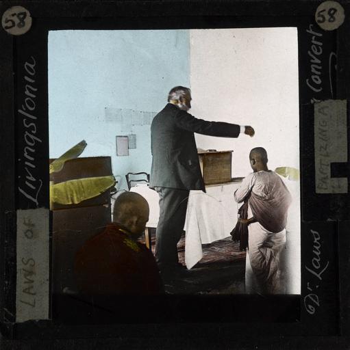 Keywords: Dr Robert Laws Baptizing a Convert, Malawi, ca. 1910-ca. 1925 (imp-cswc-GB-237-CSWC47-LS5-1-058).jpg en <br> Dr Robert Laws Baptizing a Convert Malawi ca 1910-ca 1925 Photograph of the Scottish missionary Dr Robert Laws baptising a convert Dr Laws is standing on an elevated platform and is holding his hand over the head of the man being converted Another individual can be seen to the bottom left of the photograph ; This belongs to a series of Church of Scotland Foreign Missions Committee lantern slides relating to Dr Robert Laws 1851-1934 the Scottish Missionary In 1875 inspired by David Livingstone 1813-1873 Laws travelled to Malawi and was involved in the foundation of the mission station of Livingstonia on the shores of Lake Nyasa During the succeeding 50 years he also established a network of hundreds of schools In 1908 Laws was elected moderator of the General Assembly of the United Free Church of Scotland Photographer Unknown Subject personal name Laws Robert 1851-1934 Filename imp-cswc-GB-237-CSWC47-LS5-1-058 tif Coverage date 1910/1925 Part of collection International Mission Photography Archive ca 1860-ca 1960 Type images Part of subcollection Photographs from the Centre for the Study of World Christianity University of Edinburgh U K ca 1900-ca 1940s Repository name Centre for the Study of World Christianity Archival file impaunpub_Volume7/1561 url Repository address The University of Edinburgh School of Divinity New College Mound Place Edinburgh EH1 2LX United Kingdom Geographic subject country Malawi Format aacr2 1 lantern slide 8 x 8 cm Geographic subject continent Africa Rights Contact the repository for details Part of series Laws of the Pioneer LS5/1 Repository email divinity-CSWC ed ac uk Subject lcsh Keyword Baptismal sermons Date created 1910/1925 Publisher of the digital version University of Southern California Libraries Subject aat genre interior views Format aat lantern slides Legacy record ID impa-m68646 Access conditions http //www ed ac uk/schools-departments/divinity/research/centres/world-christianity/collections-resources File GB 237 CSWC47/LS5/1/58 1910/1925 author http //digitallibrary usc edu/cdm/ref/collection/p15799coll123/id/64681 PD-old-70-1923 Magic lantern images Images from USC Digital Library uploaded by Fæ International Mission Photography Archive ca 1860-ca 1960 |
