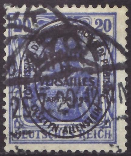 | Keywords: DRAbstG 1920 Allenstein MiNr19 B002.jpg Stamp of the German Empire - plebiscite area Allenstein ; definitive stamp; Germania-issue mostly war press from 1914/15 with black standing oval ovewrprint of the Entente-commission<br /> Stamp Michel No 19 Michel No 87II war press of 1914/15 with overprint ; Yvert Tellier No 19 DR-AL ; AFA No 19 DR-AL <br /> Color grey ultramarine<br /> Watermark Germany No 1 rhombs <br /> Nominal value 20 Pfennig <br /> Postage validity - 1920-05 1920-08-20 <br /> Postmark Lyck other date 1920-07-25 Lyck then East Prussia - Ermland - Regierungsbezirk Gumbinnen - Landkreis Lyck ; contemporary Ełk in Poland scan of original other date 1920-05 first issue of the stamp <br /> other date 1920-07-25 date of postmark Deutsche Reichspost - Commission d'administration et de plébiscite Olsztyn - Allenstein PD-Polish PD-Germany-§134-KUG 1917 Philately Germania-issue war press of 1914/15 with black standing oval ovewrprint of the Entente-commission other date 1920-05 Deutsche Reichspost - Commission d'administration et de plébiscite Olsztyn - Allenstein Creator Paul Eduard Waldraff Reichsdruckerei Berlin letterpress printing comb perforation K 14 14¼ Deutsche Abstimmungsgebiete - Allenstein Nr 19 1920 stamps of Olsztyn 19_2_2 Overprints on Germania stamps History of Ełk |