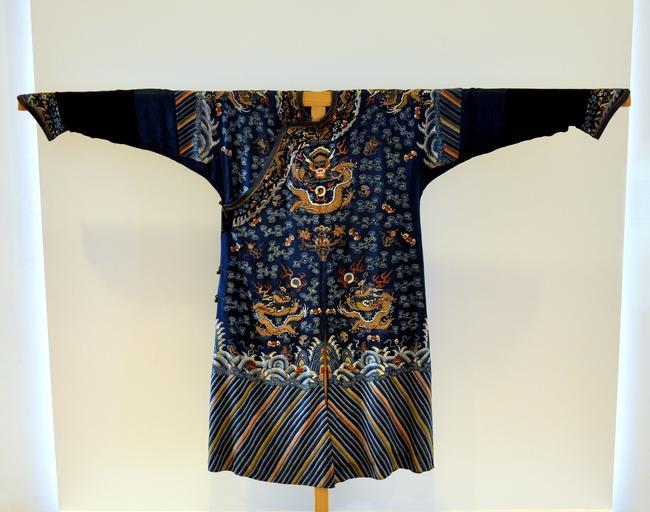 | Keywords: Drachengewand makffm 14629.jpg žDrachengewand eines kaiserlichen Beamten blaues Atlasgewebe bestickt mit Atlasstich Knötchenstich und Anlegetechnik in Seide žPferdehuf-Manschetten und Verschluss mit Brokatborte; China Qing-Zeit; spätes 19 Jh ; Museum für Angewandte Kunst Frankfurt am Main Inv Nr 14629 Schenkung Hermann Reich žDragon Robe of a Mandarin an imperial civil servant; China Qing Dynasty; late 19th century; Museum für Angewandte Kunst Frankfurt am Main Inv No 14629 donated by Hermann Reich own 2011-04 Photo User FA2010 Asian art in the Museum für Angewandte Kunst Frankfurt Clothing of the Qing Dynasty |