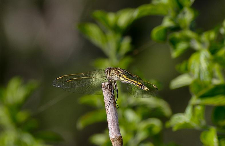 Keywords: dragonfly insect black yellow wings lacy resting green