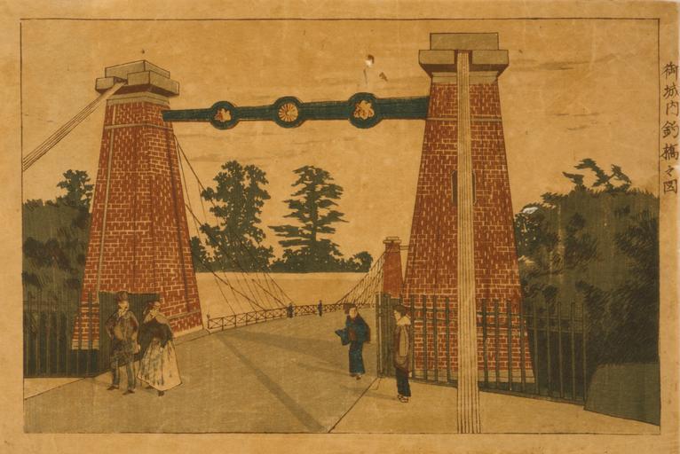 | Keywords: Drawbridge at the entrance of the Imperial palace.jpg Gojō nai tsuribashi no zu trans Drawbridge at the entrance of the Imperial Palace 1 print on hōsho paper woodcut color ; 20 5 x 32 cm block 23 x 34 3 cm sheet Rotated and cropped but not otherwise altered from version at source site Library of Congresshttp //hdl loc gov/loc pnp/cph 3g10413 latter half of the nineteenth century Creator Kobayashi Kiyochika artist PD-Japan Kobayashi Kiyochika | ||||
