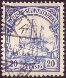 | Keywords: DRCol 1900 SWA MiNr014 B002.jpg Stamp of the German Empire - German colonies - German South West Africa; 1900; colonial ship drawing<bR /> Stamp Michel No 14 1900-11 ; Yvert Tellier No 16 1901-01 ; AFA No 16 1900-01 <br /> Color blue bright blue to violet-ultramarine <br /> Watermark none<br /> Nominal value 20 Pfennig<br /> Postage validity - 1900-11 1915-07 scan of original other date 1900-11 issue of the stamp Deutsche Reichspost - Deutsche Post in Deutsch-Südwestafrika PD-Namibia PD-Germany-§134-KUG PD-1923 <gallery> File Briefmarke waterberg jpg The same stamp other variant </gallery> Philately German colonial ship drawing; Imperial yacht SMS Hohenzollern other date 1900-11 Deutsche Reichspost - Deutsche Post in Deutsch-Südwestafrika Reichsdruckerei Berlin letterpress printing comb perforation K 14 14½ Deutsches Reich - Deutsche Kolonien Südwestafrika Nr 14 1900 stamps of German South-West Africa 14_2_2 SMY Hohenzollern on stamps of German South-West Africa |