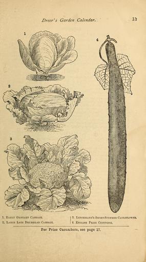 | Keywords: Dreer's garden calendar (17068981475).jpg  Drecr' s Garden Calendar <br> 1 <br> 1 Early Oxheart Cabbage <br> 2 Large Late Drumhead Cabbage <br> 3 Lexoemand's Short-Stemmed CAiaiiaowER <br> 4 English Prize Cxjgumber <br> For Prize Cucuiubers see page 17 43857270 149502 77662 Page 13 Text http //www biodiversitylibrary org/page/43857270 1884 10 5962/bhl title 77662 Henry A Dreer Firm ; Henry G Gilbert Nursery and Seed Trade Catalog Collection Biodiversity Heritage Library Dreer's garden calendar 1884 Catalogs Flowers Gardening Henry A Dreer Firm Internet resource Nursery stock Seeds U S Department of Agriculture National Agricultural Library bhl page 43857270 dc identifier http //biodiversitylibrary org/page/43857270 bhlGardenStories henry a dreer firm u s department of agriculture national agricultural library bhlgardenstories Information field Flickr posted date ISOdate 2015-04-07 Check categories 2015 August 23 CC-BY-2 0 BioDivLibrary https //flickr com/photos/61021753 N02/17068981475 2015-08-23 20 55 49 cc-by-2 0 PD-old-70-1923 Dreer's garden calendar Photos uploaded from Flickr by Fæ using a script |