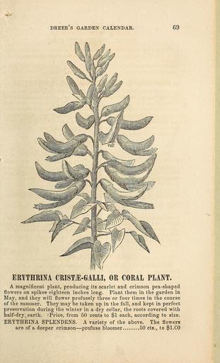 Keywords: Dreer's garden calendar 1868 (16410412976).jpg DREER S GARDEN CALENDAR <br> 69 <br> J <br> EEYTERINA CMSTJl-GALLI OE CORAL PLANT <br> A magnificent plant producing its scarlet and crimson pea- <br> flowers on spikes eighteen inches long Plant them in the garden in <br> May and they will flower profusely three or four times in the course <br> of the summer They may be taken up in the fall and kept in perfect <br> preservation during the winter in a dry cellar the roots covered with <br> half-dry earth Price from 50 cents to 1 each according to size <br> ERYTHRINA SPLENDENS A variety of the above The flowers <br> are of a deeper crimson ” profuse bloomer 50 cts to 1 C0 43808898 149128 77933 Page 69 Text http //www biodiversitylibrary org/page/43808898 1868 10 5962/bhl title 77933 Henry A Dreer Firm ; Henry G Gilbert Nursery and Seed Trade Catalog Collection NameFound EEYTERINA NameFound Erythrina splendens NameConfirmed Erythrina splendida Diels EOLID 644484 NameBankID 707734 Biodiversity Heritage Library Dreer's garden calendar 1868 Garden Stories Catalogs Flowers Gardening Henry A Dreer Firm Nursery stock Seeds U S Department of Agriculture National Agricultural Library bhl page 43808898 dc identifier http //biodiversitylibrary org/page/43808898 Coral plant bhlGardenStories Erythrina cristae-galli BHLinbloom henry a dreer firm u s department of agriculture national agricultural library bhlgardenstories bhlinbloom Information field Flickr posted date ISOdate 2015-02-03 Check categories 2015 August 24 CC-BY-2 0 BioDivLibrary https //flickr com/photos/61021753 N02/16410412976 2015-08-24 06 53 20 cc-by-2 0 PD-old-70-1923 Dreer's garden calendar 1868 Photos uploaded from Flickr by Fæ using a script