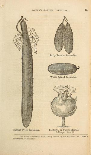 | Keywords: Dreer's garden calendar 1868 (15816300563).jpg  DREER S GARDEN CALENDAR <br> 15 <br> English Prize Cucumber <br> Early Sussiau Cucumber <br> White Spined Cucumber <br> KoMrabi or Turnip Sooted <br> Cabbage Va- e 16 <br> The above illustratious Were kindly loaned by the Publishers of Eurr's <br> Vegetables of Amluica 43808844 149128 77933 Page 15 Text http //www biodiversitylibrary org/page/43808844 1868 10 5962/bhl title 77933 Henry A Dreer Firm ; Henry G Gilbert Nursery and Seed Trade Catalog Collection Biodiversity Heritage Library Dreer's garden calendar 1868 Garden Stories Catalogs Flowers Gardening Henry A Dreer Firm Nursery stock Seeds U S Department of Agriculture National Agricultural Library bhl page 43808844 dc identifier http //biodiversitylibrary org/page/43808844 bhlGardenStories Early Prize cucumber White spined cucumber Early Russian cucumber Kohlrabi or turnip rooted cabbage BHLinbloom henry a dreer firm u s department of agriculture national agricultural library bhlgardenstories early prize cucumber early russian cucumber bhlinbloom Information field Flickr posted date ISOdate 2015-02-03 CC-BY-2 0 BioDivLibrary https //flickr com/photos/61021753 N02/15816300563 2015-08-24 06 55 55 cc-by-2 0 PD-old-70-1923 Dreer's garden calendar 1868 Photos uploaded from Flickr by Fæ using a script |
