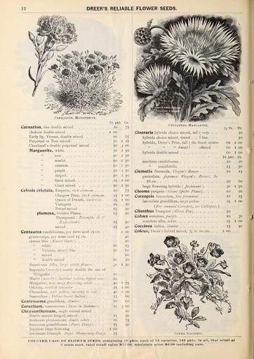 | Keywords: Dreer's wholesale price list (16166214583).jpg 12 <br> DREER'S RELIABLE FLOWER SEEDS <br> CAKftATION MARODEBITE <br> Tr pkt Oz <br> Carnation fine double mixed 20 75 <br> choicest double mixed 1 00 <br> Early flg Vienna double mixed 20 75 <br> Perpetual or Tree mixed 50 2 25 <br> Chaubaud s double perpetual mixed 50 3 00 <br> Marguerite white 50 2 50 <br> rose 50 2 50 <br> scarlet 50 2 50 <br> crimson 50 2 50 <br> purple 50 2 50 <br> striped 50 2 50 <br> finest mixed 25 I 00 <br> Giant mixed 50 2 50 <br> Celosia cristata Empress rich crimson 20 75 <br> Glasgow Prize dark crimson 25 I 00 <br> Queen of Dwarfs dark rose 25 I 00 <br> Variegata 10 20 <br> Dwarf mixed 15 50 <br> piumosa Golden Plume 15 50 <br> Thompsonii Triomphe de P <br> Exposi/ion 15 50 <br> mixed 15 40 <br> Centaurea candidissima per 1000 seed 25 cts 1 00 <br> gymnocarpa per 1000 seed 15 cts 40 <br> cyanus blue K aiscr bhi ie 10 <br> white 10 15 <br> Victoria dwarf blue 20 60 <br> mixed 10 <br> double mixed 10 20 <br> Americana Alba hirgc wliile flowers 30 I 50 <br> Imperalis nove/ty nearly double the size of <br> Margaritae 10 <br> Mariae novel/y Sulphur yellow tipped rose 24 <br> Margaritae new large Jlo7uering 7vhite 40 I 75 <br> Odorata reddish lavender 25 I 00 <br> Chameleon pale yelhnu turning to rose 40 2 00 <br> Suaveolens Yelloit' S-weet Sultati 15 60 <br> Centrosema grandiflora climber 20 60 <br> QQr stium iomenlosnm Sno7u in Stimmer 25 3 00 <br> Chrysanthemum single annual mixed 10 <br> double annual fringed mixed 15 5° <br> inodorum plenissimum double white 20 75 <br> frulescens grandiflorum /Vjm Z'azV ' 15 50 <br> Japanese large flowering I 00 <br> maximum Triumph Impd Moonpenny Daisy 25 <br> Centaurea Makgarim <br> Tr Tr <br> Cineraria hybrida choice mixed tall 1 very 50 <br> hybrida choice mixed dwarf / fine 50 <br> hybrida Dreer's Prize tall the finest strains 60 I 00 <br> dwarf/ offered 60 i 00 <br> hybrida double inixed 60 I co <br> Tr pkt Oz <br> maritima candidissima 10 20 <br> acanthifolia 15 50 <br> Clematis fiammula Virgin s Bower 10 15 <br> paniculata Japanese Virgin s Bo-uer lb <br> 8 00 20 60 <br> large flowering hybrids yac/Jwawz 30 I 50 <br> Cl ome pvmgms Giant Spider Plant 10 20 <br> Coreopsis \dLncw\2Lla Jine perennial 10 25 <br> lanceolata grandiflora large yellow 25 I 00 <br> For annual Coreopsis see Calliopsis <br> CW nthus T amY \en Glory Pea 50 <br> Cobeea scandens purple 10 30 <br> scandens alba white 25 I 00 <br> Coccinea indica climber 15 40 <br> Coleus Dreer's hybrid mixed 14 tr 60 cts I 00 <br> COBJEA SCANDKN <br> COUNTER CASK OF FI OWK K SKKD S containing; lo pkts each ol 24 varieties 240 kt in all fliut retail at <br> 5 cents each total retail value Slli OO wholesale price 00 including case 45213627 161077 84662 Page 12 Text Winter Edition http //www biodiversitylibrary org/page/45213627 1899 Dreer Henry A Firm Biodiversity Heritage Library Dreer's wholesale price list / Garden Stories Bulbs Plants Catalogs Dreer Henry A Firm Nurseries Horticulture Nursery stock Pennsylvania Philadelphia Seed industry and trade Seeds Mertz Library The New York Botanical Garden bhl page 45213627 dc identifier http //biodiversitylibrary org/page/45213627 bhlGardenStories Flowers Carnation Centaurea Margarite BHLinbloom bulbs plants dreer henry a firm nurseries horticulture mertz library the new york botanical garden bhlgardenstories centaurea margarite bhlinbloom Information field Flickr posted date ISOdate 2015-03-11 CC-BY-2 0 BioDivLibrary https //flickr com/photos/61021753 N02/16166214583 2015-08-24 21 55 18 cc-by-2 0 PD-old-70-1923 1899 catalogs Dreer's wholesale price list Photos uploaded from Flickr by Fæ using a script |