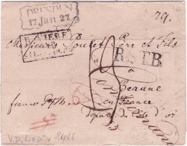 | Keywords: Dresden1827.jpg ru Письмо отп авленное из Д ездена Ко олевство Саксония в Бон Ф анция 1827 год http //www delcampe net/page/item/id 107050656 var 1827-lettre-de-Dresden-royaume-Saxe-pour-Beaune-R-T-manuscrit-franco language E html delcampe net Postal administration of Saxony 1827 PD-old ImageNote 1 105 17 333 131 981 769 2 DRESDEN Saxony 1827 ImageNoteEnd 1 ImageNote 2 92 154 331 191 981 769 2 Transit BAVIERE Bavaria in French ImageNoteEnd 2 Stampless covers of Germany Postmarks of Saxony 1827 in Germany Postal history of Saxony Postmarks of Bavaria |