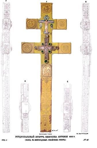 | Keywords: Drevnosti RG v1 ill026.jpg ru Д евности Российского госуда ства Antiquities of Russian country 1846 1853 Т 1 Иллюст ато Солнцев Фёдо Г иго ьевич Воздвизальный к ест епископа Антония 1212 г х анится в новго одском Софийском собо е Изоб аженный на эстампе под 25 к ест в половину уменьшенный п отив нату альной своей величины п инадлежит к числу воздвизальных кои возносимы были в собо ах и некото ых монасты ях на п аздник Воздвижения Честнаго и Животво ящаго К еста Различаясь местом и назначением своим от п естольных благословящих возлагаемых на п естоле; он х анился или в изнице или поставляем был в алта е на го нем месте Антониев к ест х анящийся в новго одском Софийском собо е сходен с полоцким св Евф осинии и с остовским Ав амиевым; он шестиконечный де евянный обложенный басменным золоченым се еб ом В шести клеймах на лицевой сто оне вычеканены изоб ажения Знамения Бого одицы Господа Вседе жителя двух хе увимов и св Иоанна Богослова ежду ними два к еста один мусийный восьмиконечный с аспятым Х истом ок уженный ликами Богомате и и св Иоанна Богослова или П едтечи а д угой с частицей Животво ящаго Д ева а боках к еста вычеканено о агиос Пет ос о агиос Павълос о агиос IBо о агиос Семьонъ и след надпись Господи помози абоu своїемu Антонu А хїепископu овго одьскuмu давшюмu к естъ Свmтой Софии Великий овго од изб ал Антония в 1211 г а хиепископом но че ез 8 лет изгнал его; потом вместе с ит офаном его п едшественником п едставил на суд мит ополиту Все оссийскому кото ый утве див ит офана в овго оде на Владычнем п естоле дал Антонию кафед у в Пе емышле После А сения овго од опять вызвал Антония на а хиепископию с кото ой он потом сошел в Хутынский монасты ь где и кончил жизнь свою и из исто ии ни из надписи не видно когда и по какому случаю соо ужен Владыкой овго одским этот к ест но по д евности более чем пятивековой по месту соо ужения и по лицу соо удителя этот надписанный памятник начала XIII в п инадлежит к любопытнейшим нашим д евностям Вместе с ним в изнице Софийского собо а находится т и панагии две а хиепископов новго одских и одна папская В С се еб яная складная с изоб ажением аспятия И Х а на д угой Спасителя E F се еб яная ук ашенная финифтью с об азом Святителя иколая H I к ест золотой с т емя п одолговатыми сквозными яхонтами на кото ых вы езано ельефом Распятие Иисуса Х иста с п едстоящими ему Богомате ью и Иоанном Богословом а т ех концах к еста изоб ажены т и пчелы по-видимому намекающие на слова Псалма CXVII 12 «Обыдоша мя яко пчелы сот» а с едок естии об атной сто оны солнце коего т ойственные лучи выступают и на д угую сто ону П и подножии к еста по снимку г Солнцева читаем надпись Urb VIII P M т е Urbanus VIII Pontifex Maximus о «Исто ическое описание Святыни овго одской» СПб 1848 г и новго одские «Губе нские Ведомости» 1848 г 9 ошибочно п иписывают этот к ест У бану IX и У бану XI Импе ат ицей Екате иной II это св ук ашение пожаловано было ит ополиту овго одскому и С -Пете бу гскому Гав иилу Пет ову а от него поступило в изницу Софийского собо а 1846 1853 http //www runiverse ru/bookreader/book403605/ page/61/mode/1up Солнцев Фёдо Г иго ьевич PD-Art Antiquities of Russian country - Volume I Files uploaded by Shakko from various sources Uploaded with UploadWizard Saint Sophia Cathedral in Novgorod objects Altar crucifixes in Russia Anthony of Novgorod 1212 in Russia Gavriil Petrov |