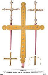 | Keywords: Drevnosti RG v1 ill028.jpg ru Д евности Российского госуда ства Antiquities of Russian country 1846 1853 Т 1 Иллюст ато Солнцев Фёдо Г иго ьевич Ста инные Ко сунские к есты и звездица Антония Римлянина Ко сунскими к естами называются зап естольные т и к еста в алта е московского Успенского собо а Один из них четы ехконечный обитый позолоченными се еб яными листами; лицевая сто она усеяна самоцветными каменьями и клеймами с об онными изоб ажениями азных святых а се едине и по концам в к угах наведены финифтью Распятие Деисус Благовещение и Воск есение а об атной сто оне поле ук ашено звездами из х усталей; на се едине и на концах в клеймах чеканные изоб ажения господских п аздников В пе еписных книгах московского Успенского собо а ск епленных в 1627 г Симоновским а химанд итом Иосифом впоследствии пат иа хом об этом памятнике благочестия сказано «За п естолом же к ест большой Ко сунский обложен се еб ом в пяти местех писаны господские п аздники мусиею на золотых цках; в нем же в гнездех сто семь х усталей» Д угие два к еста четы ехконечные из го ного х усталя ск епленные се еб ом; они утве ждены на д евках для ношения в к естных ходах а этих священных памятниках нет надписей кои бы свидетельствовали нам об их местности и д евности но п едание гласит что они пе енесены п осветителем России Владими ом I в столичный г ад Киев из поко енной им Ко суни оттуда пе ешли во Владими и потом в оскву О пе вом к есте свидетельствует книга Жезл 1655 г что он «п ед агоценный окладом неоцененный об азом д евностью п ечестный именуемый Ко сунский алта ь Господень яко солнце п освещает в собо ном х аме в мате и всех це квей» В 1812 г святыни сии не были вывозимы из осквы 1846 1853 http //www runiverse ru/bookreader/book403605/ page/61/mode/1up Солнцев Фёдо Г иго ьевич PD-Art Antiquities of Russian country - Volume I Files uploaded by Shakko from various sources Uploaded with UploadWizard Korsun cross Objects of Assumption Cathedral in Moscow Crystal Korsun cross Anthony of Novgorod Asterisk liturgy |