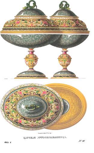 | Keywords: Drevnosti RG v1 ill043.jpg ru Д евности Российского госуда ства Antiquities of Russian country 1846 1853 Т 1 Иллюст ато Солнцев Фёдо Г иго ьевич Ца ская ми опомазанница В изнице московского Успенского собо а х анится яшмовый сосю итовый сосуд с поддоном и к ышкой из того же камня с золотым венцом и ободками пок ытыми п ек асной эмалью а к ышке п ипаяна из золота с эмалью змея свившаяся кольцом как символ муд ости и зд авия По-видимому стиль и абота сосуда п инадлежат новейшей эпохе художеств Сколь замечательна эта утва ь по ценности мате иала и по изяществу отделки столь почтенна по упот еблению ее п и венчании на ца ство госуда ей оссийских; ибо в нее тогда вливают священное ми о для их помазания екото ые из наших любителей отечественной ста ины особенно П П Свиньин в «Ка тинах России» 1838 г выдавали яшмовый сосуд за «к абийцу Августа Кеса я» кото ую по свидетельству усских летописей п ислал в 1113 г г еческий импе ато Алексий Комнин к великому князю Владими у ономаху с ца ской утва ью Сосуд этот тем более казался д агоценным для де жавцев усской земли что п инадлежал Августу кеса ю Римскому коего они п изнавали одоначальником Рю ика В духовных же г амотах великих князей начиная от сына Калиты Иоанна I до Василия II5 упомянута се доничная и се доличная ко обка кованная золотом кото ая пе еходила в наследство к ста шему сыну Ве оятно это была та же самая се доликовая к абия из коей по словам наших летописей «веселяшеся Август Кеса ь» П и этом надобно заметить что некото ые из византийских импе ато ов п исваивали себе титулы Августов и Кеса ей Что же касается до слова к абия к абица то оно вст ечается нам и в чешском языке krabice krabia от krabaty «вогнутый» «выдолбленный» scrinium «ск ынка» «ко обочка» «ковчежец» Подобное название могло быть дано в д евности сосуду высеченному из д агоценного камня В описях О ужейной палаты XVII в между посудой или судами упоминается и к абийца Посмот им тепе ь с какого в емени она появляется п и ми опомазании госуда ей оссийских После пе вого то жественного венчания на ца ство юного Дмит ия в 1498 г де жавный его дед Иоанн III пода ил ему на пи шестве се доликовую к абию Августа Кеса я Из слов остовского летописца не видно чтобы Дмит ий п инял помазание ми ом п и венчании и чтобы Августов сосуд упот еблен был п и этом св об яде хотя в ечи своей к венчанному на ца ство от оку Все оссийский мит ополит Симон сказал «Да сподобит его Бог помазатися елеем адости» П и венчании на ца ство Василия III и Иоанна IV сов еменные им летописцы не упоминают ни об Августовой к абии ни о ми опомазании о коем свидетельствует только новая укописная «Степенная книга» о ве оятно чин сего священнодействия показался недостаточным потому что ца ь Иоанн Васильевич по свидетельству Ку бского посылал к ца ьг адскому пат иа ху соловецкого инока Федо а п осить чина ца ского венчания Пе вый из ца ей усских насколько нам известно Федо I удостоен сего освящения о в чине его венчания не сказано из какого именно сосуда он был помазан св ми ом хотя все п инадлежности сего об яда по обыкновению исчислены под обно Пе есмот им чины венчания последующих ца ей не вст етится ли эта к абия п и их ми опомазании Для помазания ца ей ихаила Федо овича в 1613 г п инесли а хиепископы и епископы великое и святое ми о на златом блюде а для Алексея ихайловича в 1645 г скляничный веницейский д агий сосуд Из дел п идво ного а 