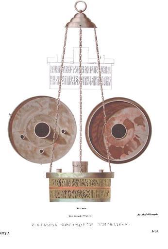 | Keywords: Drevnosti RG v1 ill049.jpg ru Д евности Российского госуда ства Antiquities of Russian country 1846 1853 Т 1 Иллюст ато Солнцев Фёдо Г иго ьевич Железное новго одское паникадило Когда по п ибытии в овго од а хиепископа Пимена в 1558 г отк ыты были св мощи епископа овго одского икиты кои ск ывала могила 450 лет тогда новго одцы благоговейные к его памяти уст оили к г обу его железную лампаду или так названную свечу По фо ме своей и знаменованию тве ди она схожа с д евними хо осами coron circuli какие упот еблялись в це квях и вешаемы были пе ед св иконами и мощами; также называется кандилом candela candelabrum а от многих свеч поликандилом или паникадилом кото ое вмещает в себе более двенадцати свеч и тем отличается от пе вого 1846 1853 http //www runiverse ru/bookreader/book403605/ page/61/mode/1up Солнцев Фёдо Г иго ьевич PD-Art Antiquities of Russian country - Volume I Files uploaded by Shakko from various sources Uploaded with UploadWizard Church chandeliers in Russia Saint Sophia Cathedral in Novgorod objects Nikita of Novgorod |