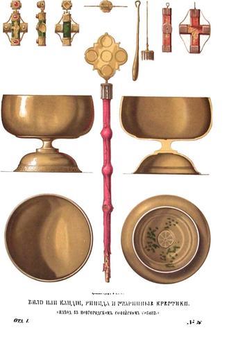 | Keywords: Drevnosti RG v1 ill077.jpg ru Д евности Российского госуда ства Antiquities of Russian country 1846 1853 Т 1 Иллюст ато Солнцев Фёдо Г иго ьевич Било или кандия ипида и ста инные к естики находятся в новго одском Софийском собо е ы уже п едставили здесь несколько достопамятных д евностей из изницы новго одского Софийского собо а; тепе ь еще об атим внимание на х анящиеся в ней вещи кои изоб ажены на эстампе под 76 д евнюю ипиду к естики и било 1 Рипида от г еч опахало вее имеет ве х се еб яный об азующий четы ьмя клеймами к ест укоятие де евянное обтянутое к асным сукном Чин литу гии нам указывает ее упот ебление кото ое по сказанию св Иакова апостола у Климента VIII 12 в священнодействии было д евнее В пе венствующей це кви ипиды уст аиваемы были из павлиньих пе ьев или тонких пе гаментных кожиц Пе воначальным их назначением было отгонять воздушных насекомых чтобы они не могли коснуться святого хлеба или впасть в аство ение чаши; потом ипидам дано высшее духовное знаменование и подобие шестик ылых хе увимов какие ве оятно изоб ажены были и в клеймах новго одской ипиды п едставляя п исутствие небесных духов п и сове шении таинства 2 К естики тельные или тельники яшмовые оп авленные в се еб о позолоченное и ук ашенные самоцветными камнями Подобные не едко попадаются в числе п ивесок на об азах в собо ных и монасты ских изницах и в соб аниях д евностей у любителей 3 едная чаша на поддоне с неснятой по к аям надписью хотя и названа на эстампе билом или кандиею о било собственно есть де евянная доска или полоса железа в кото ую уда яли колотушкой в тех обителях где не было колоколов как нап име в Палестине Что же касается до изоб аженной здесь чаши то она не что иное как настоятельская т апезная в кото ую игумен или а химанд ит уда ял за б атской т апезой когда следовало пе еменять или снимать кушанье Для такого упот ебления как видно из стиславовой г амоты Ю ьеву монасты ю Всеволод дал ему се еб яное блюдо «Велел иесмь бити в ние на обеде коли игумен обедает» Еще в д евнейшие в емена монашества был известен обычай уда ять в чашу или звонить в колокольчик за столом для пе емены кушанья чтобы не на ушить безмолвия в монашеских общежитиях; о нем упоминает Кассиан писатель V в в книге своей «De institutis coenobiorum» IV 17 3 1846 1853 http //www runiverse ru/bookreader/book403605/ page/61/mode/1up Солнцев Фёдо Г иго ьевич PD-Art Antiquities of Russian country - Volume I Files uploaded by Shakko from various sources Uploaded with UploadWizard Pectoral crosses from Russia Liturgical Fan Orthodox Church Saint Sophia Cathedral in Novgorod objects |