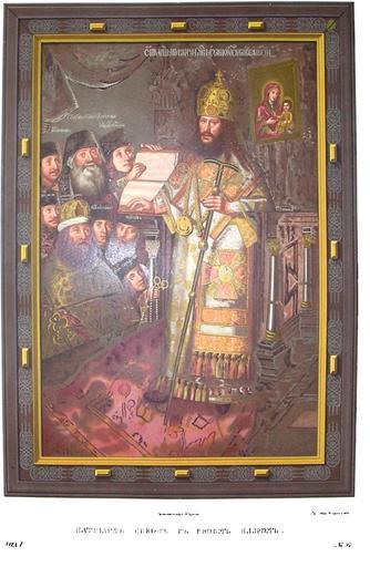 | Keywords: Drevnosti RG v1 ill095.jpg ru Д евности Российского госуда ства Antiquities of Russian country 1846 1853 Т 1 Иллюст ато Солнцев Фёдо Г иго ьевич икон Пат иа х со своим кли ом Это изоб ажение в ста инных амах писанное на холсте высотой около т ех а ши иной около двух а шин занимает место на хо ах в Воск есенском монасты е или овом Ие усалиме а нем п едставлен во всем святолепном величии своего сана на го нем или святительском месте знаменитый пат иа х икон основатель этого монасты я как значится и в надписи св`тtйшаго икона Пат їа ха осковскаго и всея Росїи ад головой его виден на стене об аз Богомате и; пат иа ху п едстоит кли его Все они в полном облачении как должно быть в собо ной службе а пат иа хе тот же самый омофо и та же мит а какие х анятся в Пат иа шей изнице; на пе сях у него панагия и к ест В левой уке у него посох с огами; п авая положена на аск ытую книгу кото ую де жит пе ед ним юный подьячий Ге ман Ему п едстоят с благоговейным вниманием его сослужебники а химанд ит Воск есенского монасты я Ге асим в фелони и мит е потом духовный отец его ие омонах Леонид ие омонах Иов а хидиакон Евфимий диакон Иосия подьячий Илиодо и наконец подьячий Се афим де жащий в уках пат иа шие четки и очки Поскольку все сии лица из монашествующих то можно с достове ностью полагать что живописец изоб азил святительское служение или п оповедание Слова Божия в монасты е Воск есенском По своему значению в пе венствующей и отечественных це квях замечателен для нас в пат иа шем кли е а хидиакон как пе венствующий над диаконами Он в монашеском клобуке потому что в а хидиаконы п и пат иа хах мит ополитах и а хиепископах поставлялись из монашествующих Чин этот существовал в оссийской це кви до издания Духовных штатов 1764 г аконец этот самый от ок подьячий Се афим соп овождал пат иа ха на Собо созванный в Чудове монасты е для низложения этого святителя и там несмот я на п епятствия п едстоял ему с к естом По соде жанию своему и в емени это изоб ажение важно не только в художественном но и в исто ическом отношении потому что п едставляет нам не только че ты и облачение вели-кого деятеля в отечественной це кви но и его кли его сот удников сост адальцев В п авильных и вместе езких че тах пат иа ха вы ажается какое-то самосознание ума пылкость и стойкость ха акте а к епость воли есмот я на то что пе еступил за полвека своей жизни он еще сох анил бод ость и свежесть сил телесных; умное и одушевленное его лицо составляет езкую п отивоположность с ок ужающими его лицами Достойное быть на пе вом плане оно вы ажает готовность на молитву и подвиг По сходству его с изоб ажением под 92 и с д угими можно заключать что он списан здесь с нату ы В ок ужающих его лицах вы ажено азличие ха акте ов воз астов наций и положений Возьмите нап име лицо духовника пат иа шего Оно являет маститого ста ца опытного в монашеской жизни ук ашенного сединами благо азумием и сми ением Ему п отивоположны лица а хидиакона и диаконов полные силы юные свежие; мужественные их че ты обещают мужественный басистый голос для коего они изби ались пат иа хом любителем святолепности це ковного служения Подобно как у д угих сослужебников во взо ах его вы ажается внимание к словам святителя; между тем как глаза двух юных подьячих уст емлены на пат иа ха в ожидании мановения его один чтобы пе еве нуть лист в книге д угой чтобы подать ему очки и четки Судя 