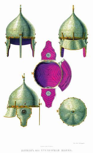 Keywords: Drevnosti RG v3 ill014 - Helm of Kuchum.jpg Шапка Е ихонская булат к асной по булату венец и ушки наведены т авы по на езке золотой у каймы под венцом опушка золотая чеканная в опушке в венце восемь камешков че вчатых да восемь лазо евых смазней да в венце над ушьми по лалику; уши п о езные на ушках на п о езке по лалу; опушка около ушей се еб еная в опушке в обоих ушах по шти би юзок да по шти иско ок яхонтовых и лаликовых; в ушах же по колечку п ивязному золотому; у затылка кайма около наведены сусальным золотом; у затылка ж т и чепи се еб еные золоченые; в затылках же по к аям семь гвоздей се еб еных золоченых ок епочных чем ок еплена подкладка; на носу наведены т авы чеадайские по на езке золотом наве ху зе но бу мицкое; подве шье т авы мелкие чеадайские наведены золотом по на езке; го одок золотой наведен финифты озными на ф яское дело; подкладка отлас че вчат; завязки у тое шапки отлас желтой; на затылке бывало золочено сусальным золотом; в золотом венце шесть мест по озших выпалых камышков; в п ежних пе еписных книгах под тою статьею написано по сказке масте ов «бывала та шапка Кучумовская уда ил челом Госуда ю Бо ис Пет ович Ше еметев» А по нынешней пе еписи ч`є года 1687 и по осмот у та шапка п отив п ежних пе еписных книг сошлась завязок нет цена двести двадцать ублев; а в п ежней описной книге написана вто ая Д евности Российского госуда ства http //www belygorod ru/img2/Solncev/Used/0ShishakIliErihons jpg < 1853 Солнцев Фёдо Г иго ьевич PD-old Antiquities of Russian country - Volume III Kuchum Jerico cap Erikhonka |