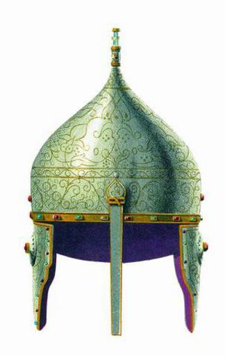 Keywords: Drevnosti RG v3 ill014a - Helm of Kuchum.jpg Шапка Е ихонская булат к асной по булату венец и ушки наведены т авы по на езке золотой у каймы под венцом опушка золотая чеканная в опушке в венце восемь камешков че вчатых да восемь лазо евых смазней да в венце над ушьми по лалику; уши п о езные на ушках на п о езке по лалу; опушка около ушей се еб еная в опушке в обоих ушах по шти би юзок да по шти иско ок яхонтовых и лаликовых; в ушах же по колечку п ивязному золотому; у затылка кайма около наведены сусальным золотом; у затылка ж т и чепи се еб еные золоченые; в затылках же по к аям семь гвоздей се еб еных золоченых ок епочных чем ок еплена подкладка; на носу наведены т авы чеадайские по на езке золотом наве ху зе но бу мицкое; подве шье т авы мелкие чеадайские наведены золотом по на езке; го одок золотой наведен финифты озными на ф яское дело; подкладка отлас че вчат; завязки у тое шапки отлас желтой; на затылке бывало золочено сусальным золотом; в золотом венце шесть мест по озших выпалых камышков; в п ежних пе еписных книгах под тою статьею написано по сказке масте ов «бывала та шапка Кучумовская уда ил челом Госуда ю Бо ис Пет ович Ше еметев» А по нынешней пе еписи ч`є года 1687 и по осмот у та шапка п отив п ежних пе еписных книг сошлась завязок нет цена двести двадцать ублев; а в п ежней описной книге написана вто ая Д евности Российского госуда ства http //www belygorod ru/img2/Solncev/Used/0ShishakIliErihons jpg < 1853 Солнцев Фёдо Г иго ьевич PD-old Antiquities of Russian country - Volume III Kuchum Jerico cap Erikhonka |
