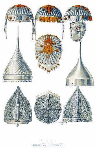 Keywords: Drevnosti RG v3 ill024.jpg Шишак и шлем Означенные на исунках 22 изоб 1 и 24 изоб 4 в описи О ужейной палаты отмечены в числе шишаков 9 и 10 но по фо ме наве шья уст оенного для вставки еловца или пе а это собственно шлемы как оные и названы в описной книге ца ской О ужейной казны 1687 г Чеканный восемью г анями с полук ужьями и клинцами над венцом записан пе вым Он был золочен и воо ужен наушниками и затылком как упомянуто из немецкого железа В п ежних книгах считался пятым; а изоб аженный на исунке 24 четве тым «Шолом чеканной г аненой; по венцу сплошь по половине к уга повыше к угов на г анях по клинцу; че ез к уг и че ез клинец и че ез г ань золочено; ветчан; наушки и затылок немецкаго железа пок ыты зеленым ба хатом; завязки отлас че вчат А по нынешней пе еписи ч`є года 1687 и по осмот у тот шолом п отив п ежних пе еписных книг сшолся; завязок нет; цена шестьдесят ублев а в п ежней описной книге написан пятой» «Шолом ветчан по чекану золочен; семь гвоздей се еб яных епейчатых; наушки и затылок немецкаго железа пок ыты ба хатом че вчатым; завязки отлас че вчат А по нынешней пе еписи ч`є года и по осмот у тот шолом п отив п ежних пе еписных книг сшолся; цена т идцать ублев а в п ежней описной книге написан четве той же» Изоб аженная на исунке 22 под чеканным шлемом ложчатая латная шапка есть собственно латный шишак кото ому соответствует в описи 1687 г 4 «шишак лощатой наушки п о езные затылок дощатой железный гвоздье медные Д евности Российского госуда ства < 1853 http //john-petrov livejournal com/1169742 html Солнцев Фёдо Г иго ьевич Author died more than 70 years ago - public domain PD-old Antiquities of Russian country - Volume III Files uploaded by Shakko from various sources |