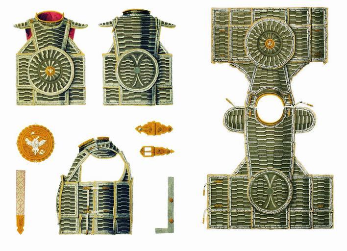 Keywords: Drevnosti RG v3 ill044-45 - Zertsalo Alex.Mikh.jpg en Mirror armour ru Зе цало ца я Алексея ихайловича а исунке подпись «Ца я Алексея ихайловича» но собственно ца ское зе цало изоб ажено на исунках 47 52 Зе цало же с долами отмечено в пе еписной книге ца ской О ужейной казны 1687 г лист 500 следующим об азом «Зе цало железные с долами че ез дол золочено и че ез дол помалевано на них пос еди о лы медные литые золоченые; воо ужены на кольцах железных бах ама шолк был к асной п яшки медные; подложены зе цала до огами к асными А по нынешней пе еписи ч`є года и по осмот у то зе цало п отив п ежних пе еписных книг сошлось во многих местех попо чены; цена двести ублев а в п ежних пе еписных книгах написано десятое» Д евности Российского госуда ства http //john-petrov livejournal com/1190678 html Солнцев Фёдо Г иго ьевич < 1853 PD-old Antiquities of Russian country - Volume III Zertsalo Alexis I of Russia's items
