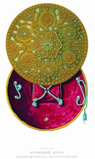 Keywords: Drevnosti RG v3 ill064.jpg Ста инный щит ук ашенный золотом каменьями и эмалью Щит изоб аженный на исунке 64 есть один из двух сове шенно одинаковых х анящихся в О ужейной палате под 4 и 5 В описи 1687 г они внесены вто ым и т етьим « Г Щит шит волоченым золотом се еб ом; по местам шиты т авки се еб ом; наве шье у щита и по щиту шесть мишеней больших да шесть мишеней половинчатых п омеж мишеней звенца косые и повыше венца т авочки и венец се еб еные золоченые езные; в наве шье у щита вве ху плащ к углой яшмовой большой да пониже его т и плаща поменьши к углые ж яшмовые; в них по низаному епью да в т ех больших мишенях т и плаща побольши тех к углые яшмовые ж в них по низаному епью да в т ех половинчатых мишенях т и плаща четве о-угольные яшмовые ж; да с еди щита во шти местех по яшмовому плащу п одолговаты; во все яшмовые плащики в езываны золото с гнездами в гнездах по щоту золотаго дела масте а Ивана яхкова семьдесят шесть иско ок яхонтовых че вчатых да пятнадцать изум удных; в том числе в ве хнем плаще изум уд г аненой четы е места по озжих двенадцать би юзок; наве шье ж в т ех больших шаломчатых гнездех да в т ех мишенях больших да в т ех половинчатых в больших же шеломчатых гнездех семьдесят две иско ки яхонтовых че вчатых да девять би юзок да в наве шье ж и около щита в венце и по щиту в больших и половинчатых мишенях и в венцах и в т авочках в гнездех в больших и малых тысяча т иста семьдесят четы е би юзы больших и малых; подложен и подушечка ба хат че вчат около подушечки десять колец се еб еных с п обойцы и с епейками; п ивяска у подушки и воо уда шолк лазо ев столбец По я лыку написано «великому Госуда ю челом уда ил Г еченин Ца ьго одец Иван атвеев в году н`и 1650 Цена пятьдесят ублев А по нынешней пе еписи ч`є года и по осмот у тот щит п отив п ежних пе еписных книг сшолся; цена тому щиту т иста ублев а в п ежней описной книге написан седьмой» Д евности Российского госуда ства http //john-petrov livejournal com/1190678 html Солнцев Фёдо Г иго ьевич < 1853 PD-old Antiquities of Russian country - Volume III Files uploaded by Shakko from various sources