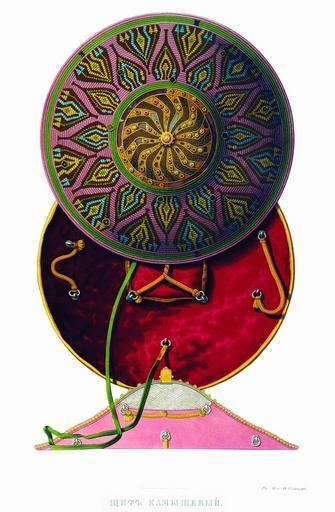 Keywords: Drevnosti RG v3 ill068 - Kalkan Kamysh.jpg en Shield Kalkan ru Щит камышовый В 1658 г послы Име етинского ца я Александ а п ивезли ца ю Алексею ихайловичу в да два щита Один из этих щитов ис 68 внесен в опись 1687 г с обозначением этой п исылки «Щит витой волоченым золотом с озными шолки; наве ху плащ булатной косые г ани наведены золотом; меж наводных г аней г ани золотые с каменьем; наве ху плаща т убочка золотая с би юзками; на большом плаще в золотых г анях в гнездах восемьдесят два камышка би юзок и яхонтиковых иско ок в том числе со ок мест по озжих а иные гнезда оз ы маны; десять епейков железные золочены в них п ик еплены с исподи десять колец; подложен и подушечка ба хат че вчат п ивяска и воо уда столбец шолк зелен кольца железные По записной книге написано «Великому Госуда ю челом уда или елетинскаго Александ а Ца я послы во k`з году 1659 цена т и убли» А по нынешней пе еписи ч`є года тот щит п отив п ежних пе еписных книг сшолся а по осмот у и с п ежними шестьдесят мест по озжих; цена тому щиту пятьдесят ублев а в п ежней описной книге написан пе вой надесять» Щит изоб аженный на исунках 66 и 67 внесен в опись без означения откуда поступил «Щит шит золотом и шолком на нем мишень по булату насечено золотом и каменьем; в гнездех би юзы десять лаликов да изум удец да иско ки лаловые а в иных местех и каменья нет гнезда сломаны; подложен ба хатом удожолтым; десять колец медных; п ивяска тесма и сну ы шолк зелен; на ве ху в маковке каменя нет два места по озжи и с т етьего места в се едине выломлено семьдесят мест по озжих А по нынешней пе еписи ч`є года п отив п ежних пе еписных книг сшолся и по осмот у све х п ежних два места по озжих и с гнездами нет; цена тому щиту пятьдесят ублев а в п ежней описной книге написан т етей надесять» pl Tarcza Kałkan Д евности Российского госуда ства http //www belygorod ru/img2/Solncev/Used/0SchitKamyshovyy jpg Солнцев Фёдо Г иго ьевич < 1853 PD-old Antiquities_of_Russian_country_-_Volume_III Kalkan shield |