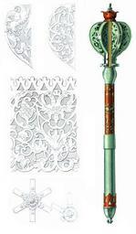 Keywords: Drevnosti RG v3 ill081b - Shestopior.jpg Шестопё «Пе нат о шти пе ах на пе ье п о езаны т авы и поставлены в лице об учи вызолочены п иве нуты щу упами в об уче по т и щу упа железные; на ве ху ко уна с яблоком п о езным вызолочены а на ве ху яблока малинькие яблочки железные не золочены; под пе ьем яблоко с по езкою; в лице под яблоком п ием медной п о езной позолочен; посе едь яблока и от яблока укоятка г аненая позолочена; повыше исподнева яблока спуск медной п о езной позолочен и п иве нут одним щу упом; яблоко че ез г ань п о езано; под исподом яблока поставлено в лице с пуговкою пуговка сквозная» Д евности Российского госуда ства < 1853 Солнцев Фёдо Г иго ьевич Author died more than 70 years ago - public domain PD-old Antiquities of Russian country - Volume III Ceremonial maces Flanged maces Maces of Russia Pernach |