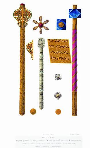 | Keywords: Drevnosti RG v3 ill084.jpg 84 В Буздыхан поднесенный ца ю Алексею ихайловичу в 1658 г г еком Дмит ием Астафьевым По описи 1687 г этот буздыхан поднесен ца ю Алексею ихайловичу в 1655 г г еком Дмит ием Астафьевым «Быздыган пе ья п о езные золотые с винивты в главе яхонт че вчет большой г аненой под ним десять изум удов; в пе ье сто восемь яхонтов че вчатых да т идцать шесть изум удов; че ен п о езной золот попо чен; исподняя т убка сходит; по я лыку написан тот быздыган шестопе ом; челом уда ил Великому Госуда ю тем быздыганом Г еченин Дмит ей Остафьев по k`г году июля в к`з день А по нынешней пе еписи ч`є года и по осмот у тот быздыган п отив п ежних пе еписных книг сшолся; цена тому быздыгану шестьсот пятьдесят ублев а по п ежней описной книге написан вто ым» Д евности Российского госуда ства http //john-petrov livejournal com/1190678 html Солнцев Фёдо Г иго ьевич < 1853 PD-old Antiquities of Russian country - Volume III Files uploaded by Shakko from various sources Alexis I of Russia's items |
