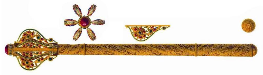 | Keywords: Drevnosti RG v3 ill084a - Shestopior.jpg Шестопё Пода ен Алексею ихаловичу в 1655 «Быздыган пе ья п о езные золотые с винивты в главе яхонт че вчет большой г аненой под ним десять изум удов; в пе ье сто восемь яхонтов че вчатых да т идцать шесть изум удов; че ен п о езной золот попо чен; исподняя т убка сходит; по я лыку написан тот быздыган шестопе ом; челом уда ил Великому Госуда ю тем быздыганом Г еченин Дмит ей Остафьев по k`г году июля в к`з день А по нынешней пе еписи ч`є года и по осмот у тот быздыган п отив п ежних пе еписных книг сшолся; цена тому быздыгану шестьсот пятьдесят ублев а по п ежней описной книге написан вто ым» Д евности Российского госуда ства < 1853 Солнцев Фёдо Г иго ьевич Author died more than 70 years ago - public domain PD-old Antiquities of Russian country - Volume III Ceremonial maces Flanged maces Maces of Russia Pernach |