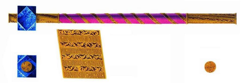 | Keywords: Drevnosti RG v3 ill084c - Brus.jpg Б ус с наве шием из лазу ика «Булава Самфи ная г аненая че ен поволочен ба хатом че вчатым по ба хату пе евив се еб яная золочена и че нью наведена че ез г ань; на т убке под булавою написано Госуда ево Ца ево и Великаго Князя ихаила Федо овича всея Русии имя езью че ез г ань; а д угие г ани езные золочены с че нью да т убки на ве ху в исподи се еб яные ж езные золочены че ез г ань с че нью А по нынешней пе еписи ч`є года и по осмот у та булава п отив п ежних книг сошлась; цена той булаве пятьдесят пять ублев; а по п ежней описной книге та булава написана пе вою надесять» Д евности Российского госуда ства < 1853 Солнцев Фёдо Г иго ьевич Author died more than 70 years ago - public domain PD-old Antiquities of Russian country - Volume III Maces of Russia Ceremonial maces |