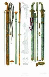Keywords: Drevnosti RG v3 ill097 - Palash.jpg ru Палаши «Да све х п ежней описной книги полаш полоса булатная на ней с обе сто оны по два дола с обе сто оны два до конца а два до ельмана с опушкою; на п авой сто оне мишень с отметцы; ножны поволочены ба хатом алым; оп ава на нем че нь и к ыж и устье две обоймицы и кольцы и наконешник золотые; пояс столпчатой шолк к асной Цена тому полашу двести т идцать ублев» «Полаш полоса стальная в езывано золото т авы че ен яшмовой ножны поволочены ба хатом цветным; земля се еб еная оп ава на ножнах золотая в че ену и в оп аве в езывано золото ж с каменьи П ислан в О ужейной п иказ из Посольскаго п иказа во н`г году 1645 декаб я во в день; а в памяти за п иписью дьяка Степана Куд явцова написано «Куплен у Семена Волынскаго дан сто ублев» А по нынешней пе еписи ч`є года 1687 и по осмот у тот полаш п отив п ежних книг сшолся по обе сто оны в езывано золото че ен яшмовой оп ава золотая; к ыж устье и наконешник два б анца а с одной сто оны в золоте яшмы а с д угой с че нью; в че ену в наконешнике яшмы по обе сто оны; в че ену ж и в оп аве девяносто камешков и иско ок яхонтовых че вчатых и изум удных; в наболдашнике изум уд г аненой; по п ежним пе еписным книгам четы е места по озжих поясу нет А по нынешней пе еписи ч`є года и с п ежними десять мест по озжих А по нынешней же оценке тому полашу цена сто шестьдесят ублев а по п ежней описной книге написан тот полаш пе вым» en Palashes Д евности Российского госуда ства < 1853 Солнцев Фёдо Г иго ьевич Author died more than 70 years ago - public domain PD-old Antiquities of Russian country - Volume III Swords of Russia Broadswords