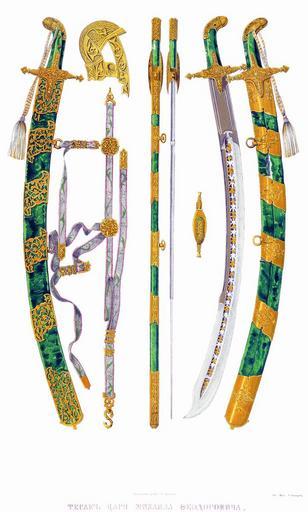 | Keywords: Drevnosti RG v3 ill116 - Sabre Tesak.jpg en Sabre of Mikhail I Fyodorovich Romanov Master czech Nil Prosvit 1617 Bulat steel ru Сабля в описи тесак ихаила Фёдо овича 1617 асте - чех ил П освит адпись на сабле «Sy tesak sdeelan poweleniem Gossudara Tzaira i welikoвo Knesa Michaila Feodorowitcha vsea Rrusyi v paetoie leeto gossudarstwa ieвo maesetza Po prikasu kraitscheвo y oruschnitscheвo Michaila Michai-lowitscha Saltikowa; deelal master Nial Proswit» Из описи «Тесак осковскаго дела езан нап оем езь пок ыта золотом да се еб ом в долу слова и голомя по обе сто оны наведены золотом а наголомяны по обе сто оны наведены по два долика; ножны поволочены ба хатом зеленым; оп ава на ножнах се еб еная п о езная золочена в осьми местех; пояс тесма шолк зелен с золотом; оп ава на поясу се еб еная п о езная золочена в двадцати местех; у него ж темляк и кисть шолк зеленой с золотом ва во ка золотная А по нынешней пе еписи ч`є года и по осмот у тот тесак п отив п ежних пе еписных книг сшолся; цена пятьдесят ублев» Д евности Российского госуда ства http //www belygorod ru/img2/Solncev/Used/mTesakCaryaMihFed jpg Солнцев Фёдо Г иго ьевич < 1853 PD-old Scimitars Sabres of Russia Sabres of the 17th century Antiquities of Russian country - Volume III Michael I of Russia's items |