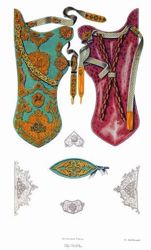 Keywords: Drevnosti RG v3 ill128.jpg ru алучие Этот саадак ис 127 и 128 из набивной кожи я инного цвета ук ашен золотыми езными плащами с че нью и в нескольких местах д агоценными камнями а с еднем большом плаще налучия по вы ажению описей «Печать Ца ства осковскаго» двуглавый о ел с московским ге бом на г уди а колчане такая же печать в меньшем азме е и све х того ниже ге ба плащ на кото ом вы езан г иф с ко оной на главе Описание этого саадака в описной книге 1687 г следующее «Саадак большаго ж на яду хоз е инной оп ава золотая езная с че нью; в налуче бенд1 и в ней в гнезде в золоте камень алмаз г аненой да изум уд г аненой в гнезде ж золотом двадцать семь яхонтов че вчатых малых а около налучи кайма т идцать пять плащей золотых в них езаны клейма с че нью а меж плащами т идцать четы е епья с че нью один епей попо чен; в оп аве на налуче два наугольника золоты езные с че нью а в них две мишени больших езаны с че нью да меж наугольника вве ху половина клейма и мишени езаны с че нью на се едине плащ большой клеймо золото езано с че нью о ел двоеглавой с ко оною; се еди о ла сидит человек на коне колет змия; по сто онам по полуклейма с мишеньми золоты езаны с че нью; в д угом плаще клеймо в нем мишень в золоте езано с че нью; в исподнем плаще в наконешнике клеймо в клейме мишень большая в золоте сп а езаны с че нью; в колчане оп авы две бенди золоты езаны с че нью а в них два алмаза в гнездех золотых г анены да два изум уда да около алмазов и изум удов по двадцати по семи яхонтов че вчетых; на колчане чепь золотая с финифты озными на чепи пять плащей золотых с финифты в них в езывано каменье пять яхонтов че вчатых; на концах у чепи два епья в них в золоте в езывано два яхонта че вчатых в гнездех а около их по девяти яхонтиков че вчатых; около колчана кайма в ней пятнадцать плащей золотых а в них по мишенце в езывано в золото с че нью меж ними семнадцать епьев золотых с че нью; вве ху под чепью наугольник в золоте в езано клеймо в клейме мишень вве ху ж половина клейма а в нем половина мишени в золоте езано с че нью; да в плаще большом в клейме о ел двоеглавой на об ез с ко уною а в нем сидит человек на коне колет змия езан с че нью а над клеймом плащик с ко уною около ево два епья золоты езаны с че нью; под тем плащем клеймо в нем г ив езан в золоте с че нью да на исподи плащ большой клеймо а в нем мишень большая в золоте езано с че нью; на исподи донцо шитое волоченым золотом назади сафьян че вчат; помочь шолк че вчат с золотом; пояс тесма шолки озные се еб о с золотом на поясу оп ава в семнадцати местех золото езано с че нью А по нынешней пе еписи ч`є года 1687 и по осмот у тот саадак п отив п ежних пе еписных книг сошолся; на налуче в клейме и в колчане плащей и епьев золотых девяти мест нет да на колчане в чепи двух яхонтиков нет да све х п ежних пе еписных книг ч` года 1682 по нынешней пе еписи в налуче двух епьев да яхонтика нет; цена тому саадаку каменью и золоту и делу семь сот пятьдесят ублев а по п ежним книгам ч` года тот саадак написан вто ым» Д евности Российского госуда ства http //john-petrov livejournal com/1190678 html Солнцев Фёдо Г иго ьевич < 1853 PD-old Antiquities of Russian country - Volume III Files uploaded by Shakko from various sources Tsars' saadak